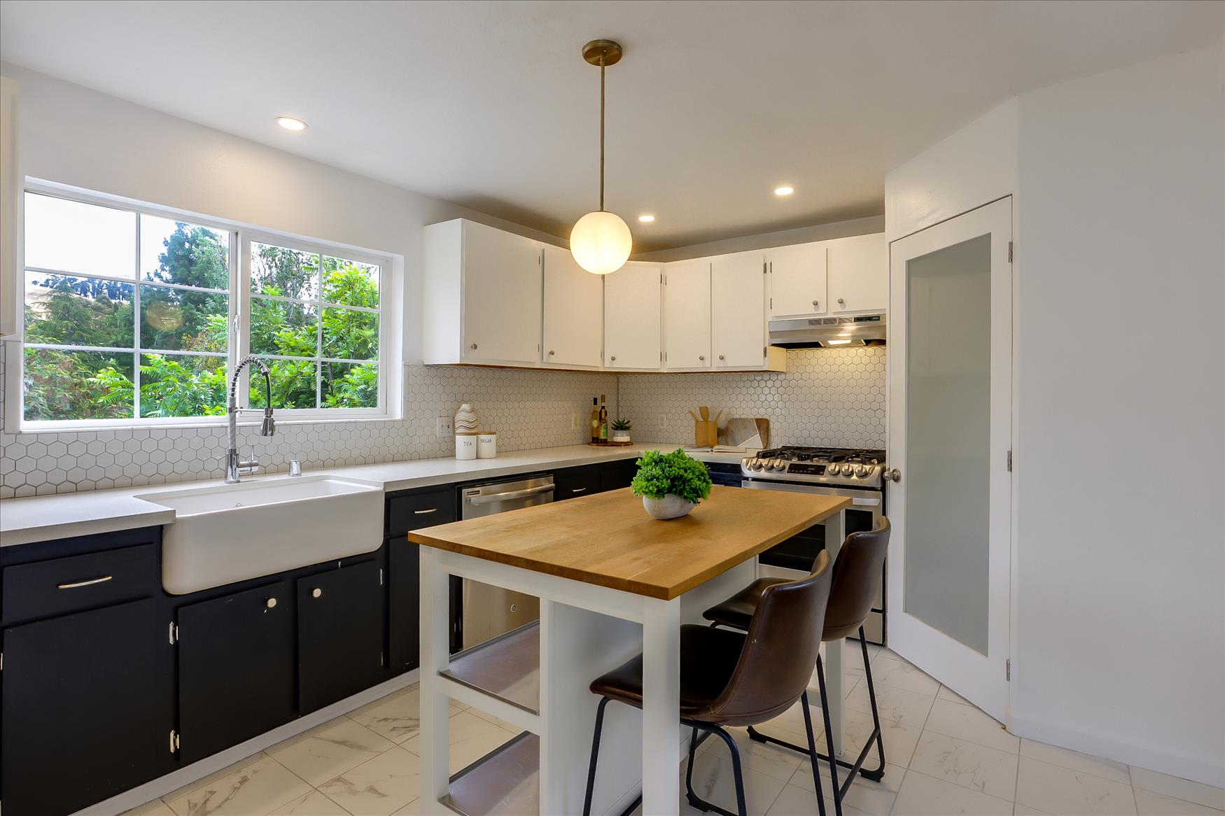 A showstopping kitchen sets the tone for entertaining, punctuated by dramatic black lower cabinets and fresh white upper cabinets, quartz counters, stainless-steel appliances, and hexagonal subway tile backsplash. Replete with a charming farm sink, the window above frames stunning views of local hillsides. Equipped with two large living areas, the home features an upper-level family room and lower-level living room with custom built-ins and adjacent laundry room with ample storage.