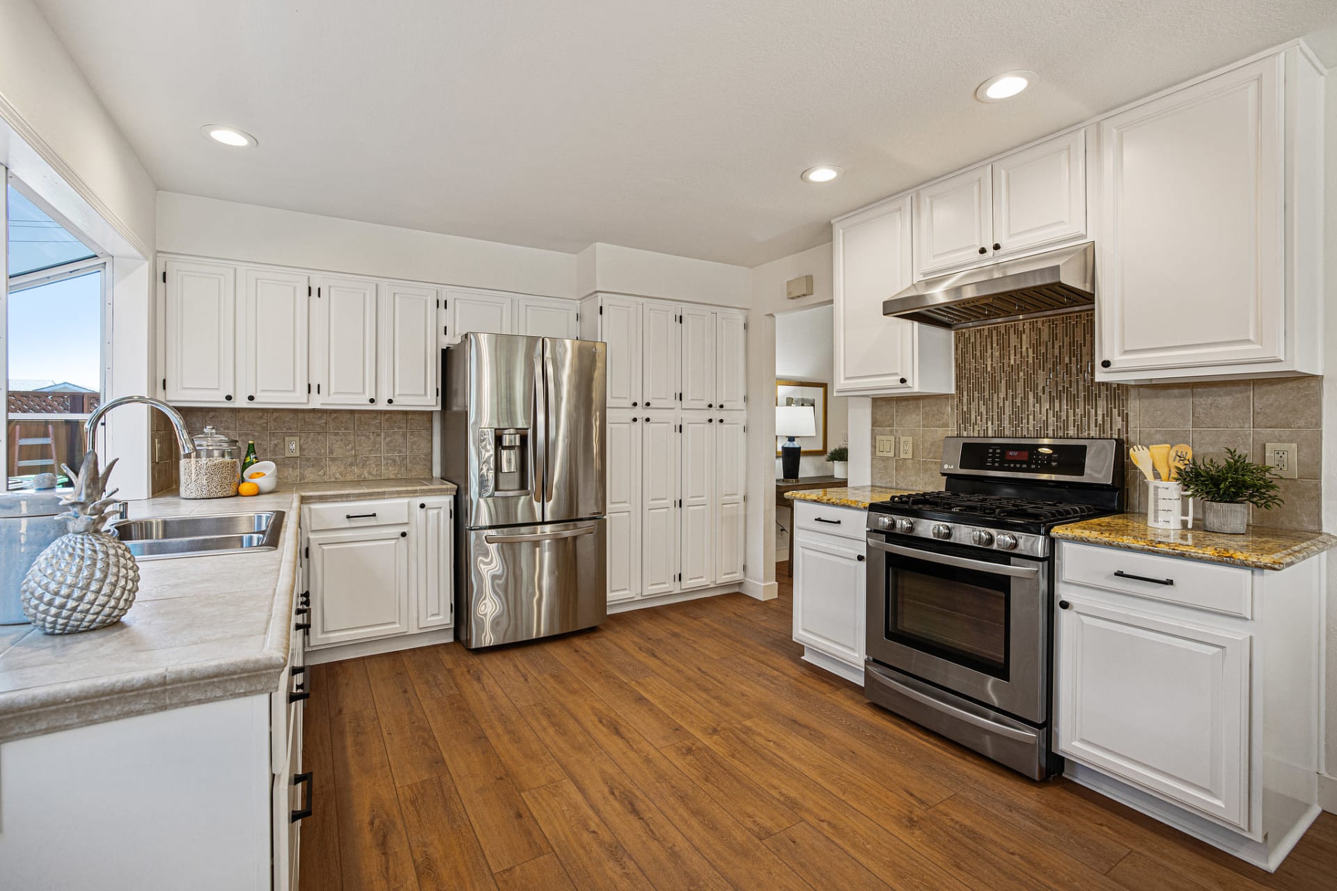 This four bedroom, two bath home has been loved by the same family for over twenty years and has a thoughtful floor plan with three bedrooms tucked on one side of the house. The fourth bedroom with French doors and front yard views offers plenty of space for guests, or easily convert it to a home office. The beautifully updated hall bath provides a deep tub and standing shower with custom tile, and shaker cabinet vanity. The bright ensuite primary bath has a walk-in shower and plenty of storage. Updated flooring throughout gives an expansive feel to the main living areas and cozy warmth to the bedrooms.