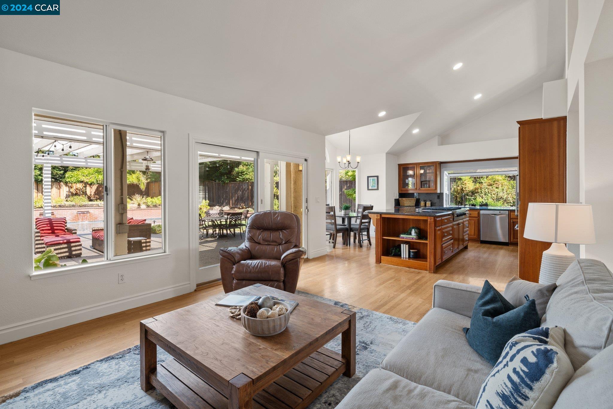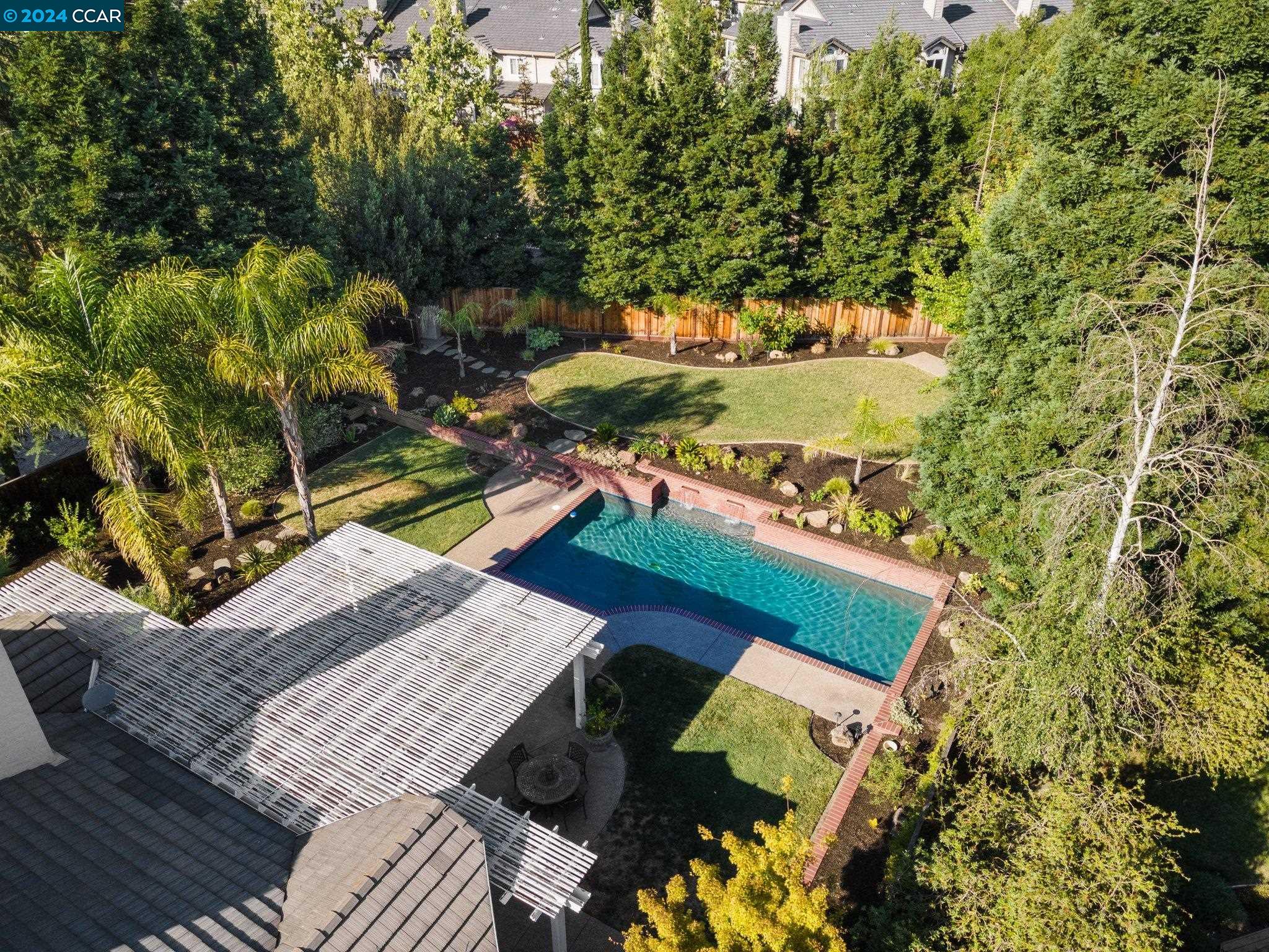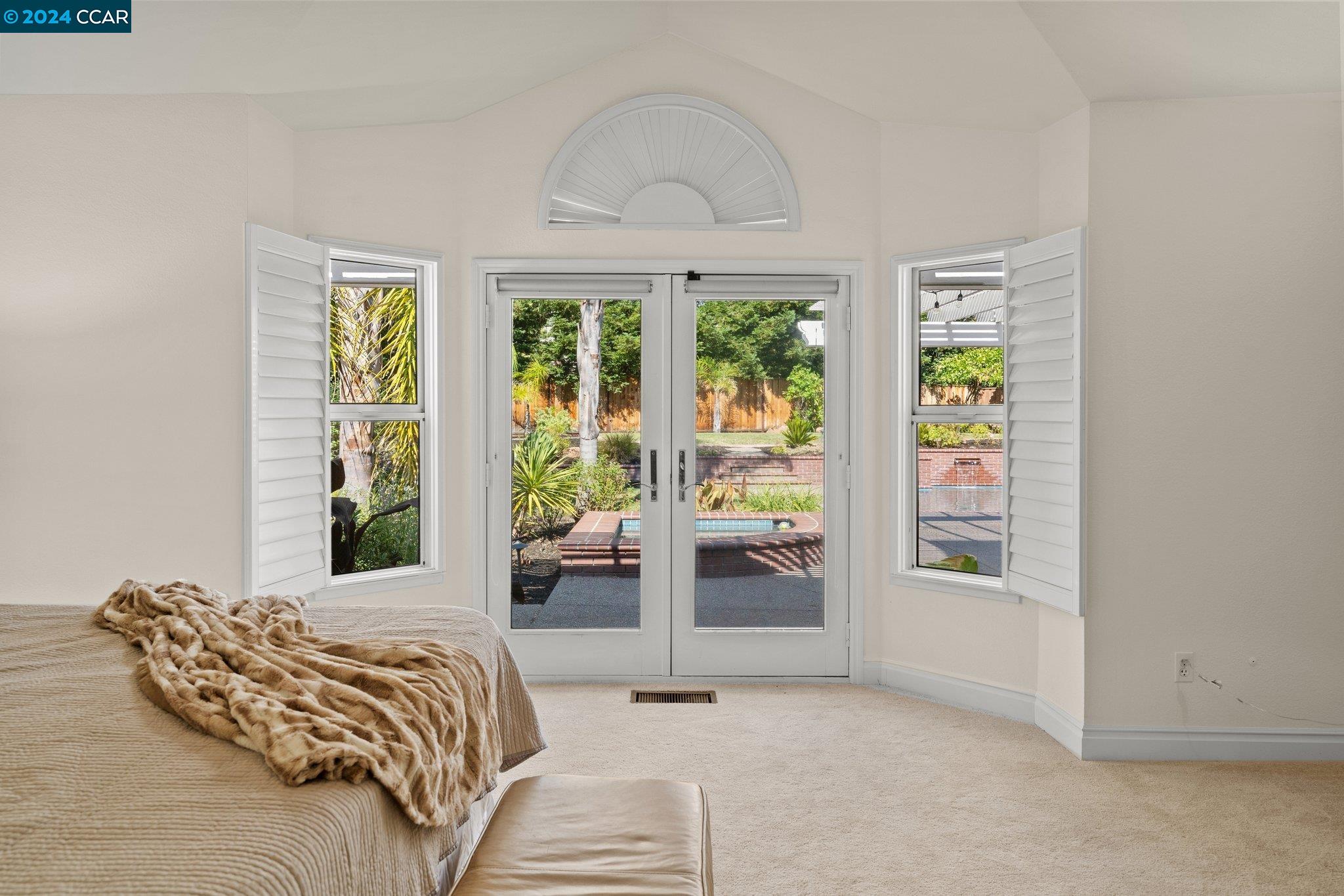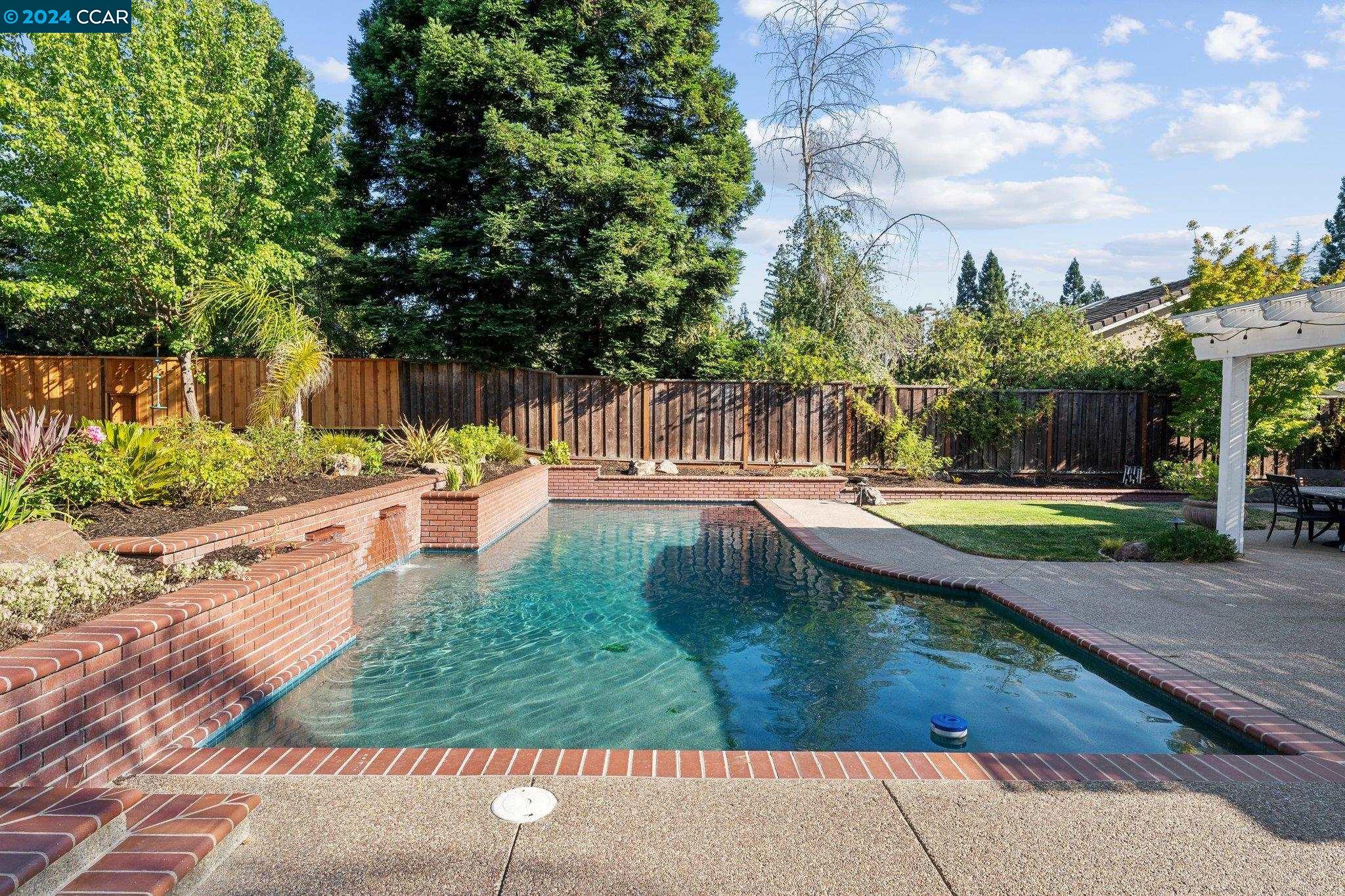 Welcome to this exceptional 4-bedroom, 2.5-bath home on a generous .35-acre lot. Nestled in a serene, private setting, this unique property offers the perfect blend of luxury and comfort. Step inside and be greeted by vaulted ceilings. The combined living & dining rooms allow plenty of space for special occasions, while the heart of the home is an open-concept living area that seamlessly connects the gourmet kitchen and family room, flowing easily to the backyard. Even everyday meals become a chef's delight in the gourmet kitchen with ample counter space, storage, a gas range, and stainless-steel appliances. The main floor features a primary bedroom with ensuite bath, providing the ultimate in privacy or functionality for multi-generational living. French doors in the primary bedroom transition perfectly to the expansive backyard. Step outside to a private oasis, where a sparkling pool and spa await. The expansive, flat lot offers endless possibilities for outdoor activities and entertaining. Stroll up the grand, curved staircase to the second floor and find three large bedrooms and another full bathroom. These rooms are light and bright, yet close the shutters and it is sure to be a cozy way to end the day. Don't miss this perfect blend of luxury, comfort, and convenience!