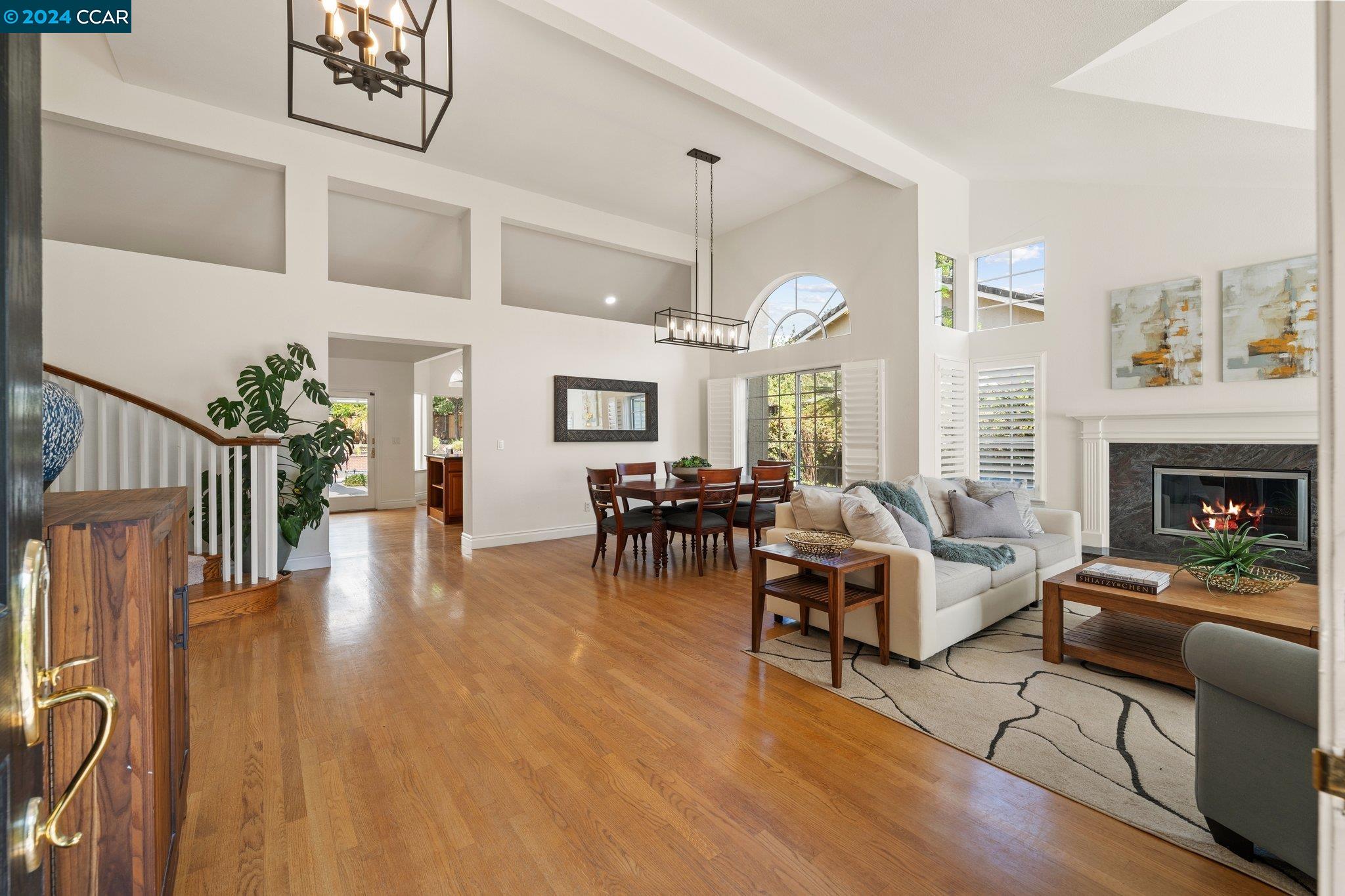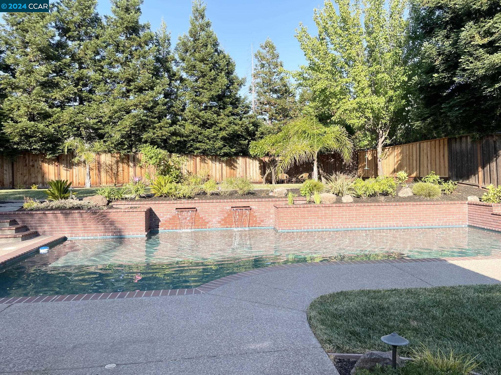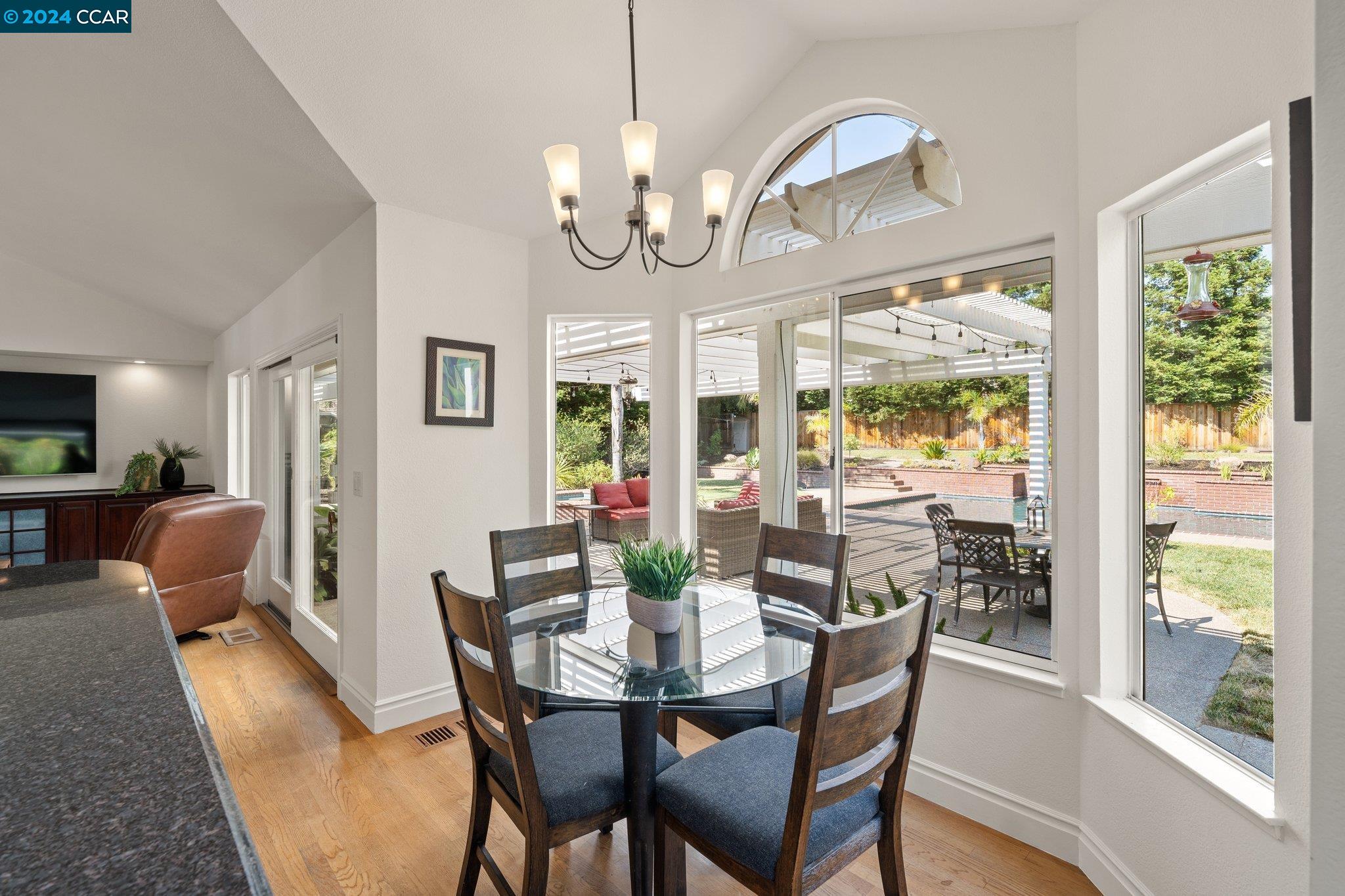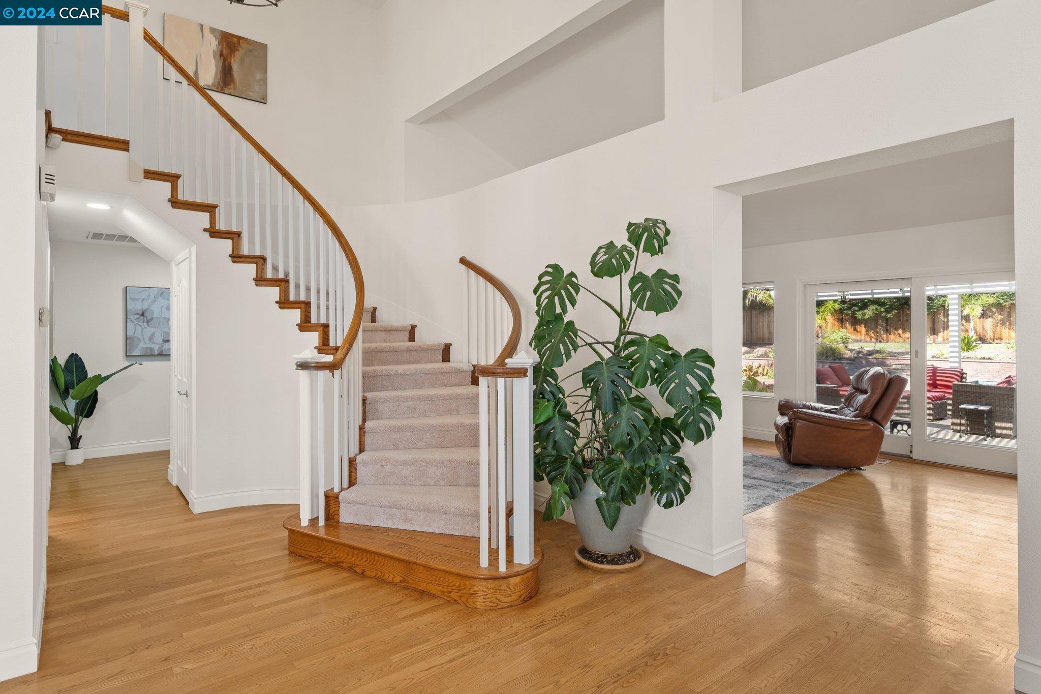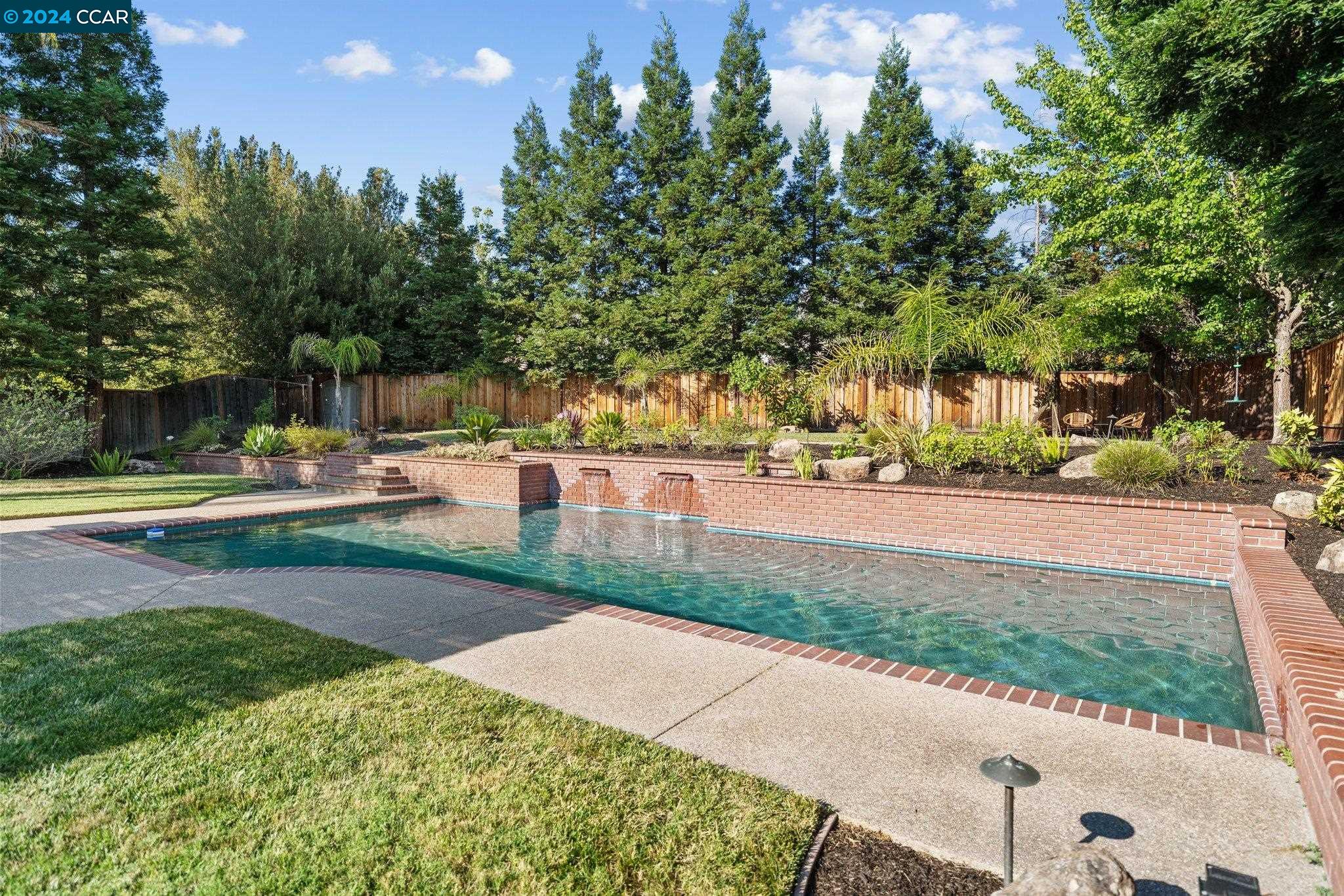 Welcome to this exceptional 4-bedroom, 2.5-bath home on a generous .35-acre lot. Nestled in a serene, private setting, this unique property offers the perfect blend of luxury and comfort. Step inside and be greeted by vaulted ceilings. The combined living & dining rooms allow plenty of space for special occasions, while the heart of the home is an open-concept living area that seamlessly connects the gourmet kitchen and family room, flowing easily to the backyard. Even everyday meals become a chef's delight in the gourmet kitchen with ample counter space, storage, a gas range, and stainless-steel appliances. The main floor features a primary bedroom with ensuite bath, providing the ultimate in privacy or functionality for multi-generational living. French doors in the primary bedroom transition perfectly to the expansive backyard. Step outside to a private oasis, where a sparkling pool and spa await. The expansive, flat lot offers endless possibilities for outdoor activities and entertaining. Stroll up the grand, curved staircase to the second floor and find three large bedrooms and another full bathroom. These rooms are light and bright, yet close the shutters and it is sure to be a cozy way to end the day. Don't miss this perfect blend of luxury, comfort, and convenience!
