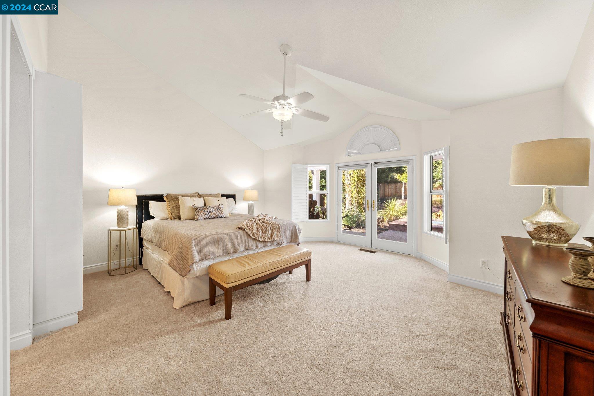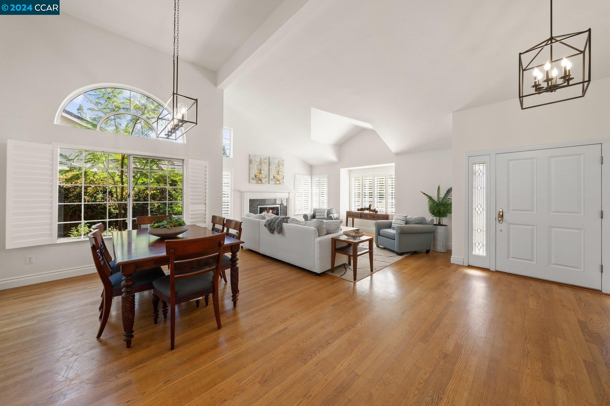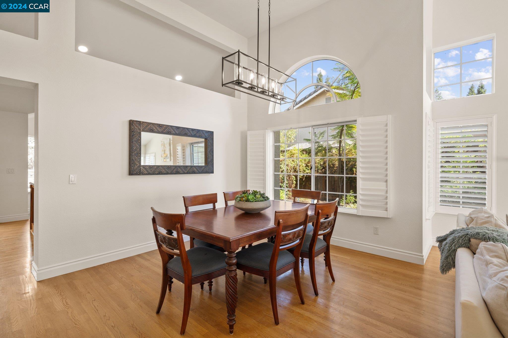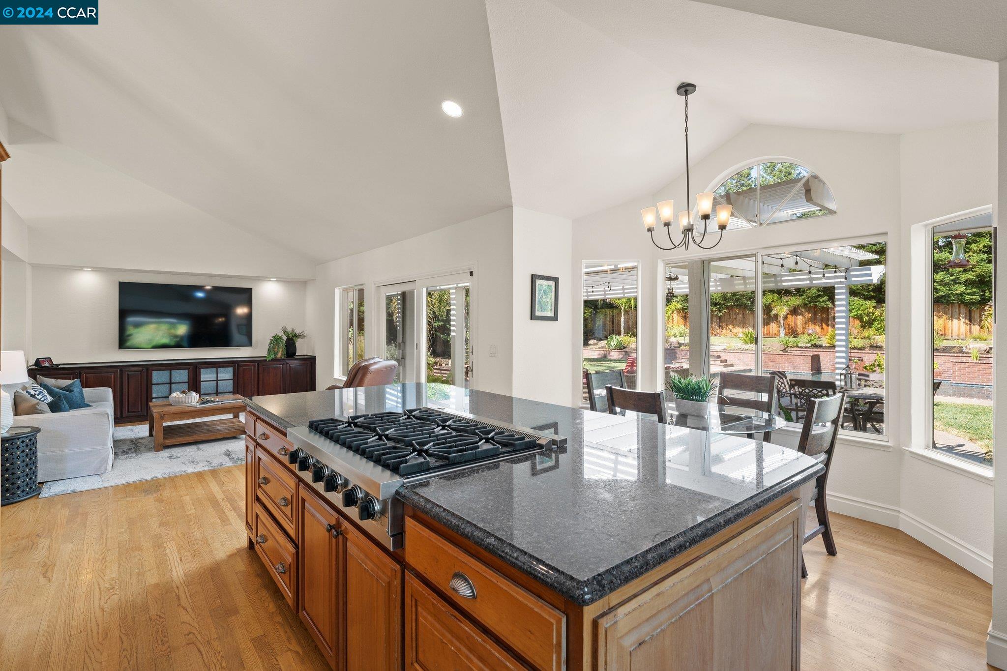 Welcome to this exceptional 4-bedroom, 2.5-bath home on a generous .35-acre lot. Nestled in a serene, private setting, this unique property offers the perfect blend of luxury and comfort. Step inside and be greeted by vaulted ceilings. The combined living & dining rooms allow plenty of space for special occasions, while the heart of the home is an open-concept living area that seamlessly connects the gourmet kitchen and family room, flowing easily to the backyard. Even everyday meals become a chef's delight in the gourmet kitchen with ample counter space, storage, a gas range, and stainless-steel appliances. The main floor features a primary bedroom with ensuite bath, providing the ultimate in privacy or functionality for multi-generational living. French doors in the primary bedroom transition perfectly to the expansive backyard. Step outside to a private oasis, where a sparkling pool and spa await. The expansive, flat lot offers endless possibilities for outdoor activities and entertaining. Stroll up the grand, curved staircase to the second floor and find three large bedrooms and another full bathroom. These rooms are light and bright, yet close the shutters and it is sure to be a cozy way to end the day. Don't miss this perfect blend of luxury, comfort, and convenience!